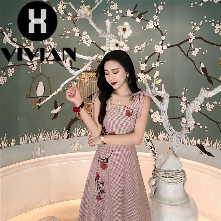 Seller dress korea ?VIVIAN? Dress Midi Wanita Korea Tanpa Lengan Strap Pita Simpul Motif Bordir Bunga Elegan Vintage