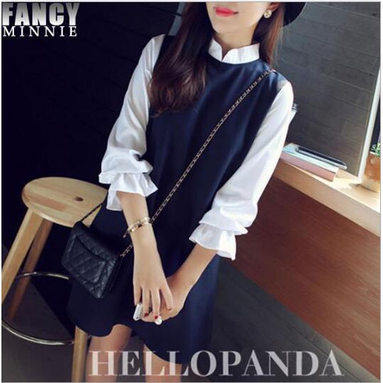 Seller dress korea Dress Lengan Panjang Model Longgar Gaya Korea, Warna Hitam & Putih, Ukuran Plus