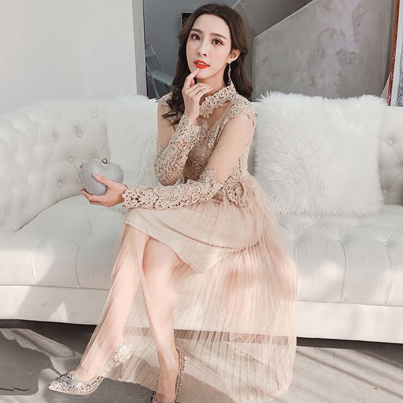 Produk 2Pcs Dress Midi Wanita O-Neck Lengan Panjang Splice Lace+Mesh+Shift Gaya Korea untuk Musim Semi ketika dirating di posisi 23 untuk pencarian [ Fashion ].