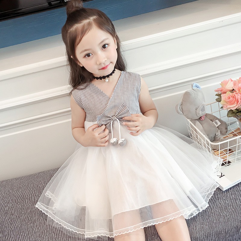 Penjual dress korea Dress Princess Korea Anak Perempuan Tanpa Lengan Bahan Katun Aksen Pita Simpul untuk Musim Panas