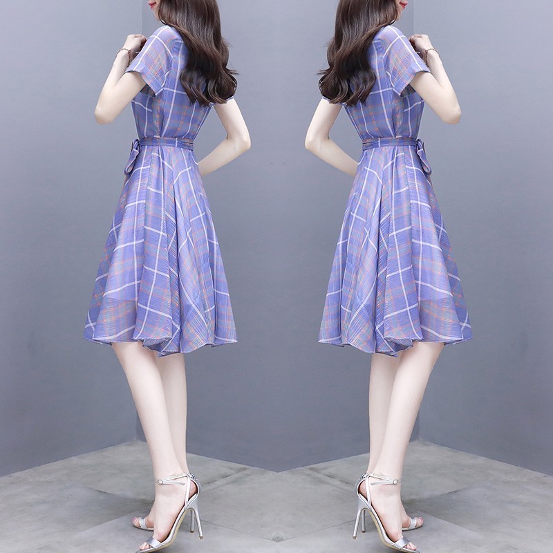 Seller dress korea Dress Midi Gaya Korea Elegan Motif Kotak-kotak Bahan Sifon untuk Wanita